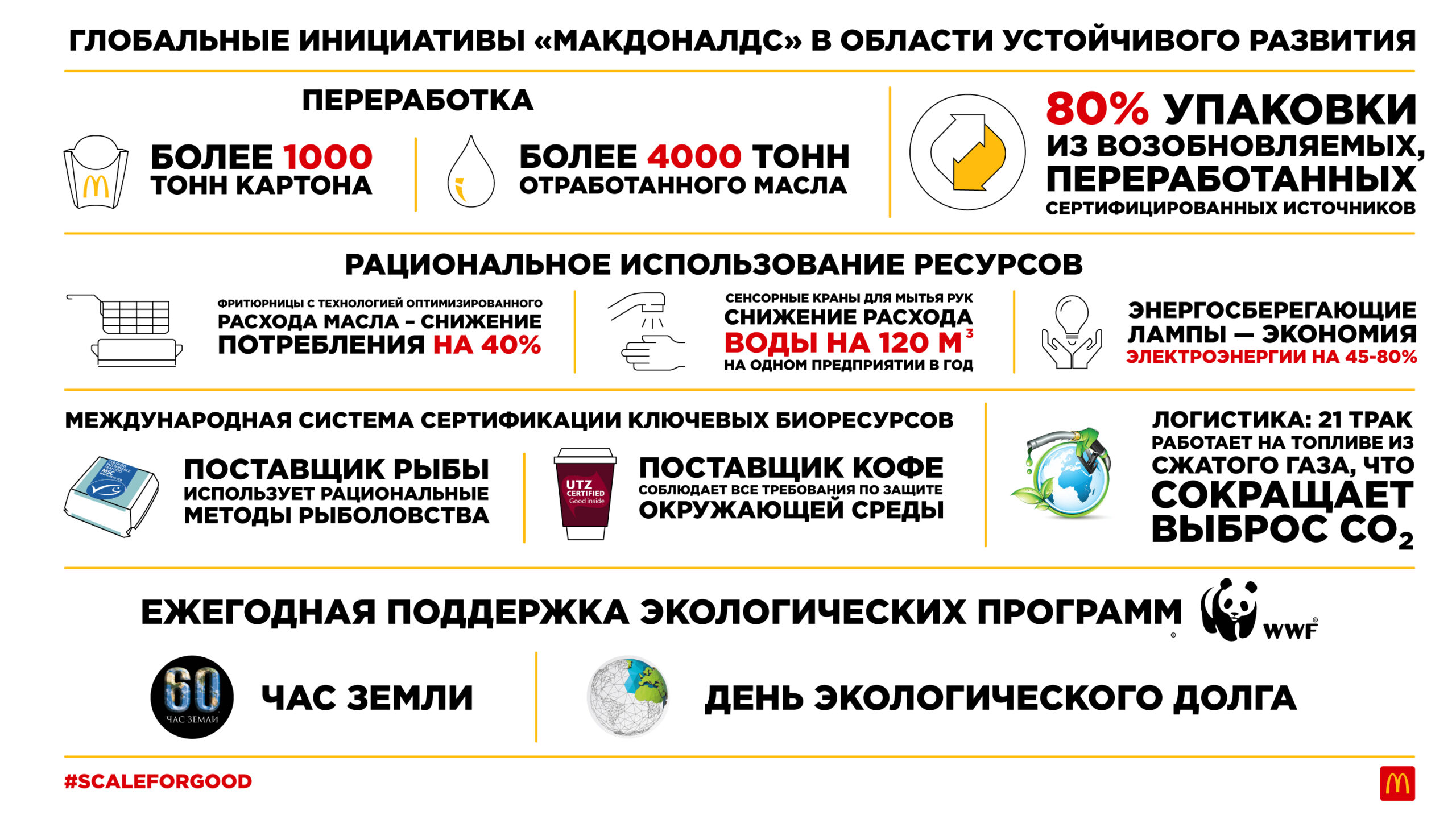 «Макдоналдс» в России уже сегодня вносит существенный вклад в выполнение глобальных обязательств компании. Практически полностью локализована цепочка поставок: на сегодняшний день доля российских поставщиков компании достигает 98%. Это значит, что не требуется длительная транспортировка, уменьшается расход топлива и других ресурсов. Расширена география дистрибьюторских центров: у логистического партнера на сегодняшний день их уже 9 по всей России. Это существенно сокращает плечо доставки, уменьшая так называемый «углеродный след». На предприятиях «Макдоналдс» в России, а также у всех поставщиков осуществляется целый ряд энерго- и ресурсосберегающих программ по борьбе с изменением климата, предотвращению вырубки лесов, охране водных ресурсов и сокращению отходов.