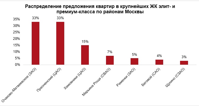 В настоящее время на первичном рынке Москвы экспонируются 11 жилых комплексов элит- и премиум-класса, площадь жилого фонда в каждом из которых превышает отметку в 30 тыс. кв. м. Эти проекты фактически являются флагманами всего сегмента высокобюджетного жилья в плане привлечения инвестиций и обеспеченности инфраструктурой. По данным экспертов компании INSIGMA GROUP (девелопер жилого квартала премиум-класса RedSide), совокупная площадь лотов, находящихся в продаже, приближается к отметке в 140 тыс. кв. м.
