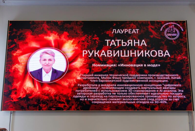 «Современная мода — это «про творчество», которому служат высокие технологии!», — заявил ведущий церемонии награждения, генеральный директор Ассоциации деятелей культуры и бизнеса «Я Лидер» Илья Юрьевич Листопадов, пригласив длянаграждения в Номинации «Инновации в моде» «За внедрение инновационных технологий 3D‑симуляции и искусственного интеллекта в процессы массового производства одежды» старшего инженера технической поддержки производственного департамента Melon Fashion Trading, члена Евроазиатской художественной ассоциации Татьяну Васильевну Рукавишникову, которая создала виртуальные аватары через 3D‑сканирование и AI‑анализ, что обеспечило идеальную посадку, персонализированное производство и значительное снижение экологического следа».