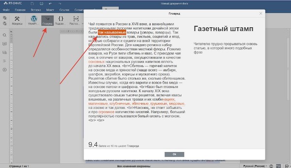 Для того, чтобы проверить написанный текст на наличие стилистических ошибок, в текстовом редакторе «Р7-Офис» можно воспользоваться плагином «Главред» — автоматической системой проверки текстов на словесный мусор и соответствие инфостилю.