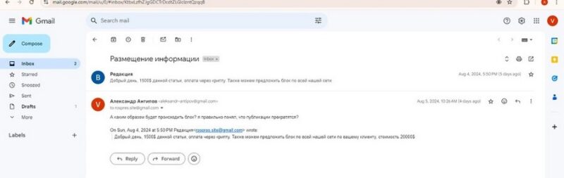 После десятков статей в компанию «Еврострой» пришло предложение на электронную почту удалить «компромат». Её скрины публиковались минувшим летом. За удаление статьи на одном из десятков сайтов Тараса Чорноивана потребовали 1500 долларов через криптовалюту. То есть 150 000 рублей. Умножаем на десятки – получаем миллионы. Сделали компании и предложение о прекращении подобных публикаций – за 20 000 долларов. По всей видимости «Еврострой» платить украинцам отказался, а вот удалённые статьи на сайтах свидетельствуют, что с кем-то из бизнесменов и не только договориться всё-таки удалось.