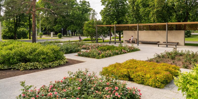 Здесь можно увидеть полынь Шмидта, ясколку, флокс шиловидный и гейхеру, сосны, каштаны и колонновидные туи….