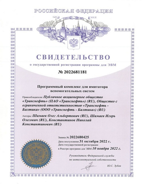 Программа для ЭВМ «Программный комплекс для имитатора вспомогательных систем» разработана сотрудниками ООО «Транснефть – Балтика»