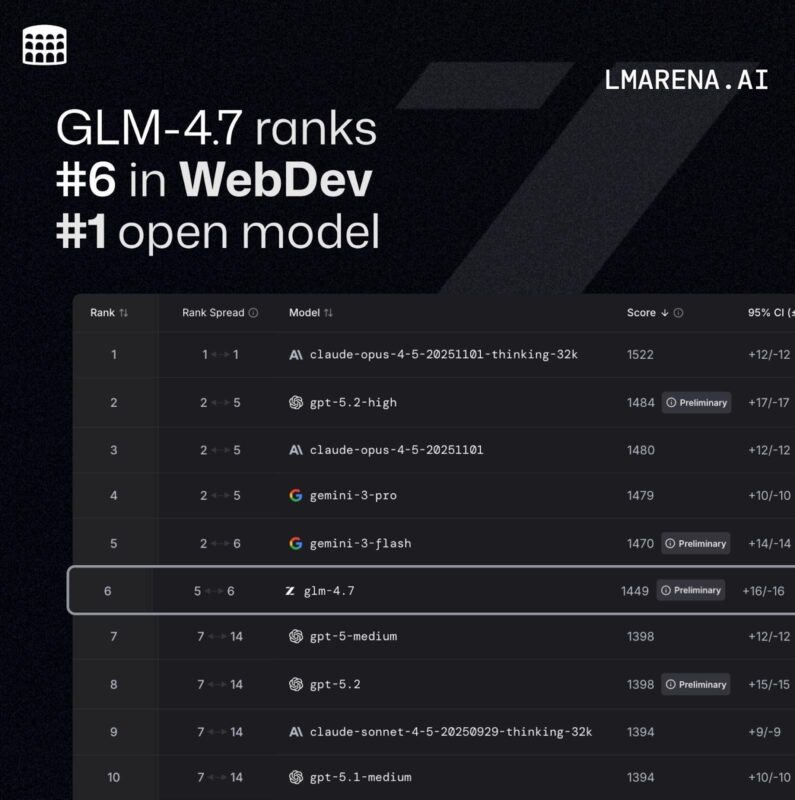 На Code Arena, крупномасштабной платформе слепой оценки с участием более миллиона участников, GLM-4.7 занимает первое место среди моделей с открытым исходным кодом, а также лидирует среди моделей, разработанных в Китае. Z.ai стала серьезным конкурентом на мировом рынке искусственного интеллекта с открытым исходным кодом, особенно в тех областях, где надежность в реальных сценариях кодирования имеет наибольшее значение.