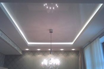 Прежде чем устанавливать такой потолок необходимо продумать вывод освещения, возможно, просто вывести люстру как на стандартном потолке или сделать небольшие отверстия в пленке для точечных светильников.