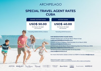 Компания опубликовала тарифы для турагентств, работающих с четырьмя отелями на Кубе. Новые тарифы разработаны с целью поддержки местной индустрии туризма. Для отеля GRAND ASTON Cayo Las Brujas для всех турагентов установлен сбор в размере 50 долл. США с человека за ночь по системе «все включено». Для GRAND ASTON La Habana, который начнет свою работу 15 марта, сбор составит 50 долл. США с человека за ночь при размещении по системе B&B. В двух других отелях ASTON за ночь будет взиматься 40 долл. США за номер. Разница в ценах обусловлена тем, что отель ASTON Costa Verde Beach Resort в Ольгине обслуживает туристов по системе «все включено», а ASTON Panorama в центре Гаваны — по системе B&B. Цены действительны при проживании в отеле в период до 30 ноября 2022 года. «Наши отели расположены в знаковых туристических местах Кубы. Туристов ждут потрясающие виды и высокий уровень сервиса. Весь персонал строго следует протоколам для обеспечения эпидемиологической безопасности. По результатам аудита Всемирного совета по путешествиям и туризму наши заведения были отмечены знаком о безопасных путешествиях Safe Travels. Мы с нетерпением ждем встречи с гостями в наших отелях на Кубе», – заявил президент и главный исполнительный директор компании Archipelago Джон Флад (John Flood).